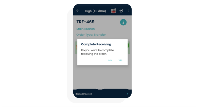 - If you wish to continue scanning against the order, tap NO to return to the previous page.