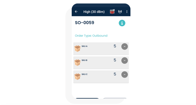 - On the Pick Order page, users can tap the trigger quickly to begin scanning the inventory to be allocated. The RFID handheld will emit a starting tone and a green reading indicator will be displayed on the screen.
