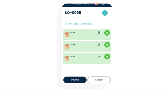 - Upon selecting an order, the Pick Order page will be shown with the order number, order type, SKU name, and SKU quantities required to fulfill the order.