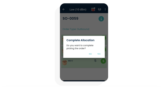 - You will be prompted to confirm if you have finished allocation against the order. Tap YES to continue and complete the dispatch of the order. If you wish to continue scanning against the order, tap NO to return to the previous page.