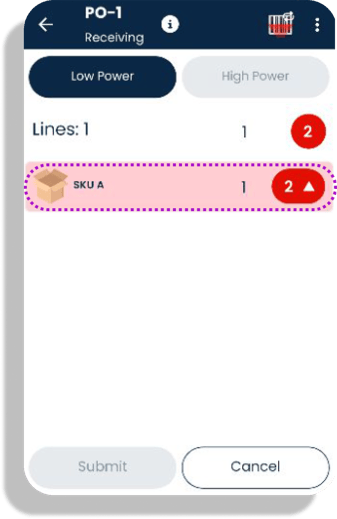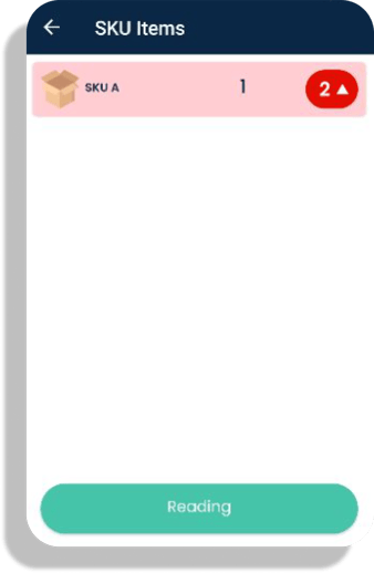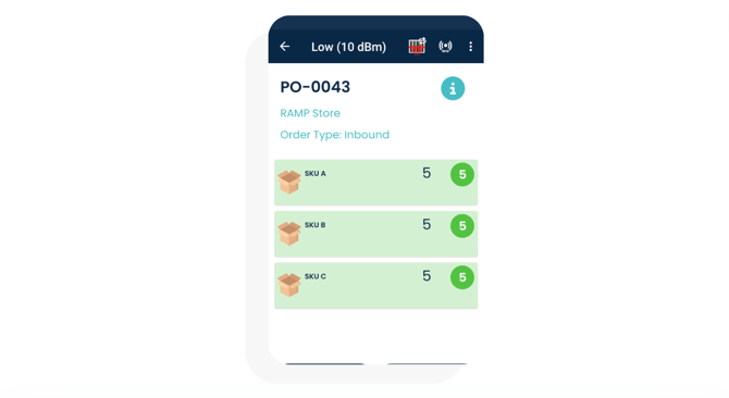 - On the Receive Order page, users can tap the trigger quickly to begin scanning the inventory to be allocated. The RFID handheld will emit a starting tone and a green reading indicator will be displayed on the screen.