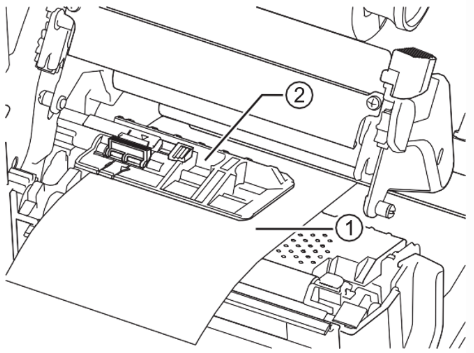 Pass the media 1 below the media sensor guide 2. If you are using labels, remove the label from the liner. Align it so that the media sensor does not sense the I-mark (black mark).