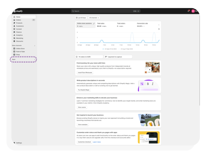 - To create a transfer order start by opening shopify and logging in. Then click Apps in the left bar.