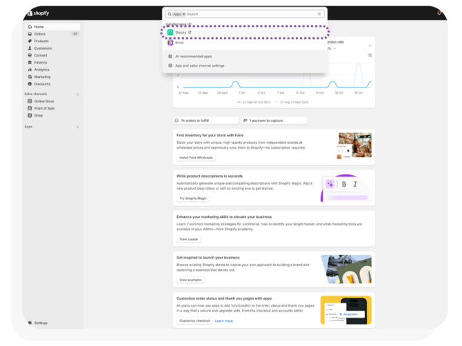 - A popup will appear below the search bar, navigate to and click on Stocky to access the stocky management system.