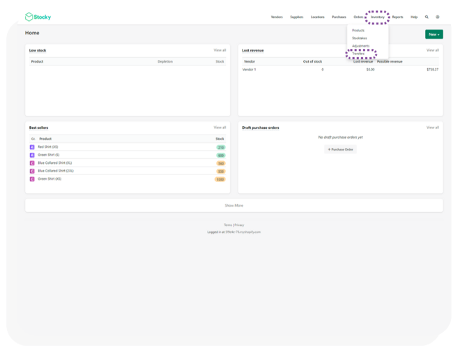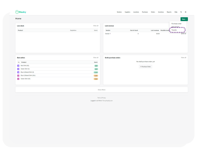 - Navigate to the transfer orders page in Stocky through Inventory -> Transfers.