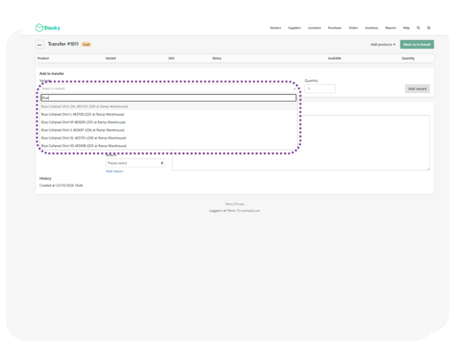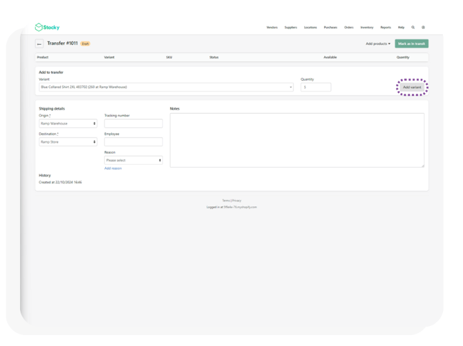 - Once the quantity has been entered, click Add variant to add the product to the TO.