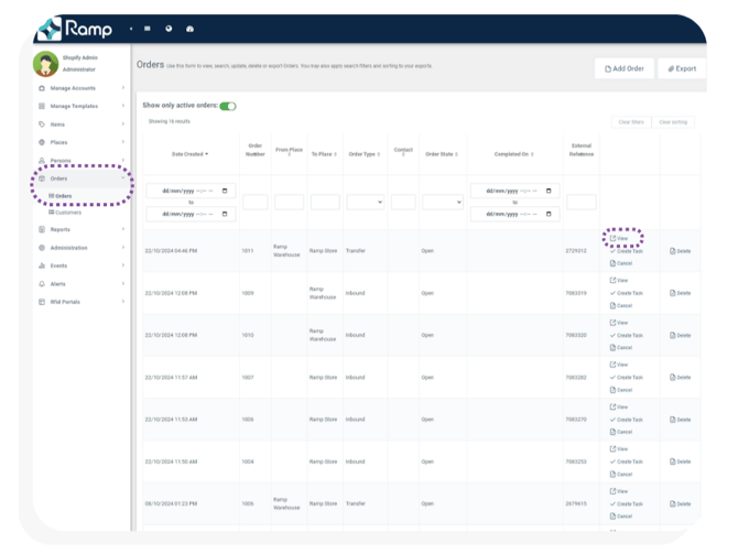 - Log into Ramp Web and navigate to Orders -> Orders in the left menu. Then navigate to the purchase order that has been received (generally identified by the Order Number) and click View on that order.