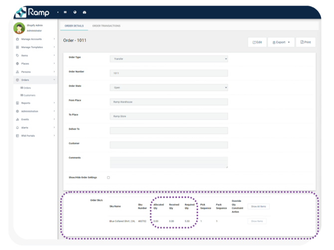 - Navigate towards the bottom of the transfer order view to Order Sku's. This area of the view allows you to compare the order quantity, received quantity and allocated quantity of a product.