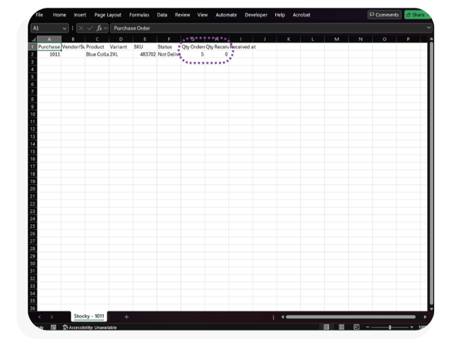 - Open the downloaded file (titled Stocky - <transfer order number>) in Excel. This file shows the quantity ordered and the quantity received and the file can be searched, sorted and filtered using Excel.