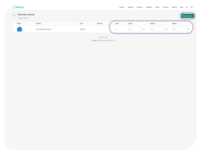 - using the Accept, Restock and Reject columns, items can be marked as received using Accept, as needing to be resent if they are missing/ damaged using Restock or rejected if they were not wanted in the order using Reject. Once the items are marked correctly, click Receive Items to mark the transfer order as entered.